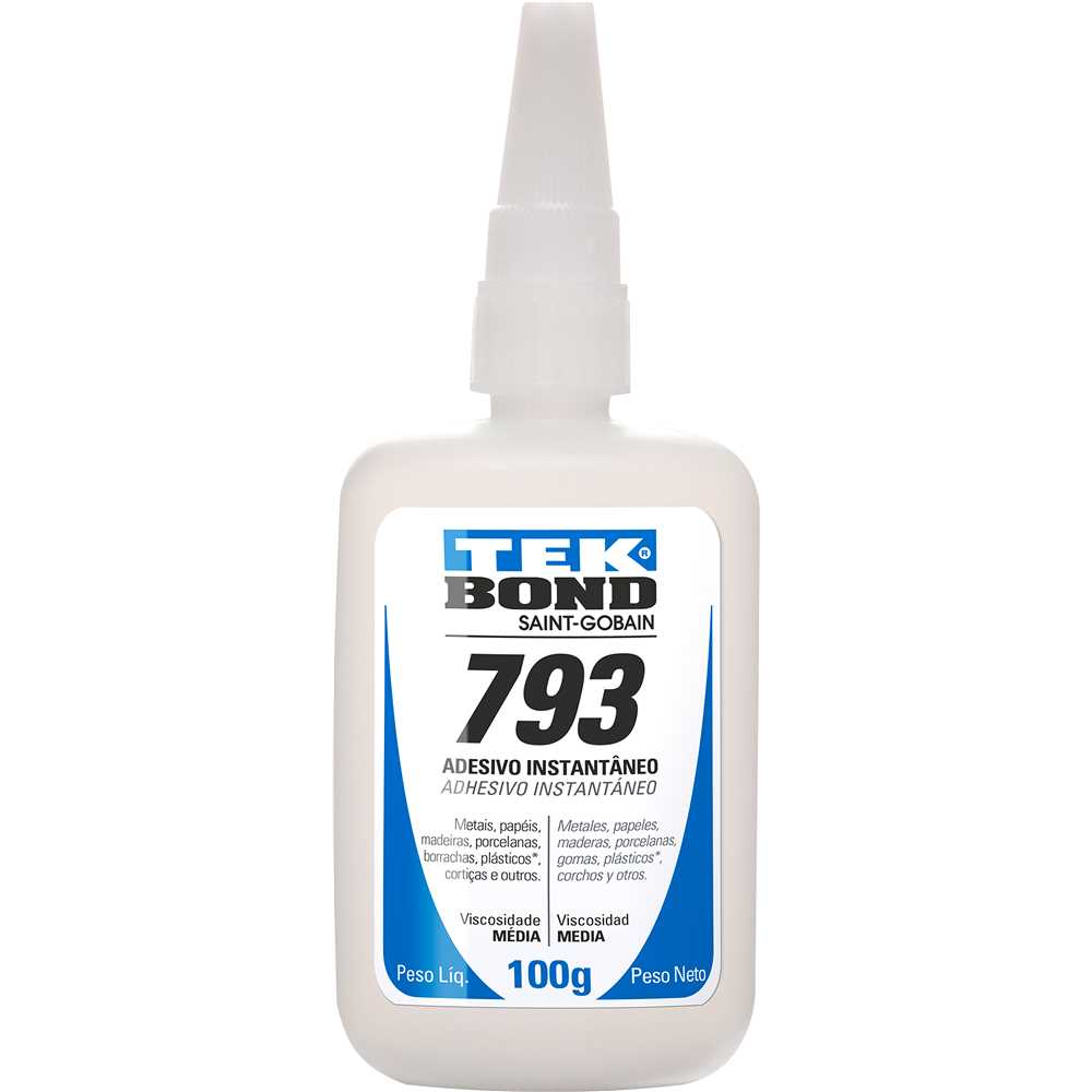 Cola Instantânea 100G Tekbond 793-A: A solução rápida e eficiente para suas colagens, especialmente em materiais porosos de difícil adesão. Ideal para reparos domésticos, artesanato, indústria e muito mais, esta cola garante uma união forte e duradoura em segundos, otimizando seu tempo e garantindo resultados profissionais. Sua formulação avançada e bico anti-entupimento proporcionam praticidade e economia, evitando desperdícios e garantindo a aplicação precisa do adesivo.